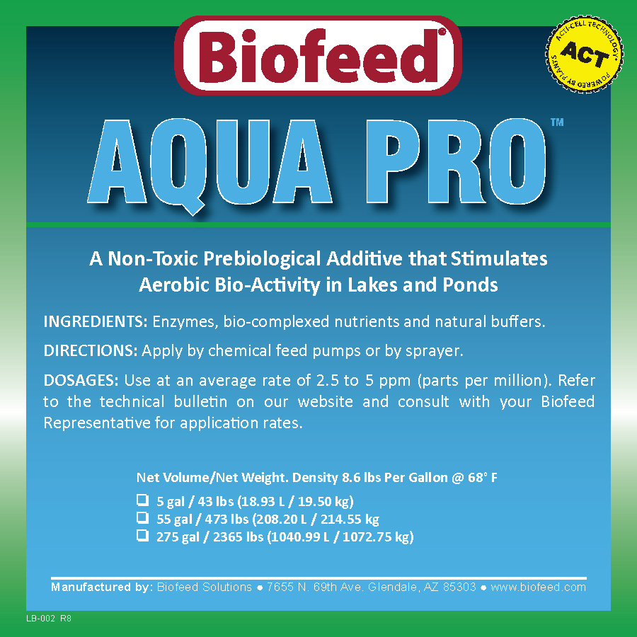 AQUA-PRO™ is an organic water conditioner of naturally derived enzymes, organic acids and growth promoting nutrients that stimulate healthier aerobic bio-activity in lakes and ponds. Sludge and odors usually exist due to a lack of oxygen and proper bio-nutrition to support microbes that break down sludge and organic matter. The solution is to release oxygen within the pond bottom to support these microbes. AQUA-PRO™ formula is an extensively tested and proven product used to enzymatically release elemental oxygen which helps to correct a variety of problems associated with pond and lake water management.