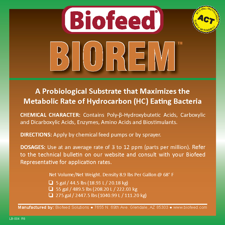BIOREM™ Is a biological substrate that promotes microbial activity, maximizing the metabolic rate of hydrocarbon (HC) eating bacteria. Its substrate activity feeds and enhances the formation of reductase enzymes, increasing the reaction rate at which complex organic molecules are disassembled. BIOREM™ also contains organic derivatives which modify and re-branch petroleum (HC) molecules making them more readily consumable via microbial activity. The addition of BIOREM™ to a waste stream allows for more complete breakdown of un-wanted hydrocarbons and sludge.
